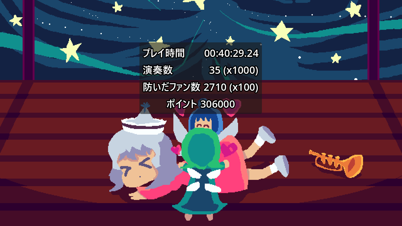 Made for the Touhou Station Touhou Game Jam 2026 by me (Art and Sound Effects) and Strelly (Programming, Music and Spanish Translation). The theme was ライブ (live).