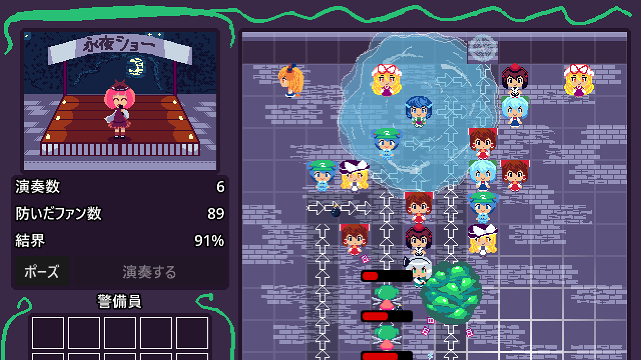 This is a tower defence game where you recruit Touhou characters as security personnel to prevent fairies from harassing the performers on stage.